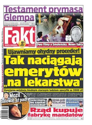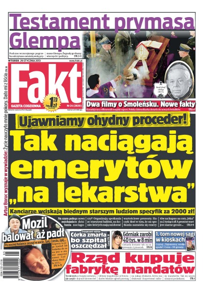 Ciało kardynała Józefa Glempa spoczęło w sarkofagu w krypcie stołecznej archikatedry; inspektor od radarów kupuje drukarnię mandatów; politycy PO przeczuwają, że minister sprawiedliwości powalczy o pozycję lidera partii; dwa filmy o Smoleńsku; jak wożą ludzi na Śląsku; fundacja powołana przez nieżyjącego już Andrzeja Czerneckiego pomaga młodzieży; Edyta Górniak dostanie 40 tys. zł za 8 minut śpiewania; Anna Dereszowska dostała mandat; czy Artur Boruc wykorzysta trzecią szansę; obsceniczny gest Dariusza Szczubiała pod adresem sędziów; Agnieszka Radwańska przez kilka dni szlifowała formę w Krakowie.
