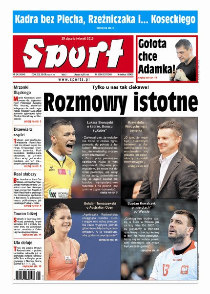 Wiceprezes ds. zagranicznych Polskiego Związku Piłki Nożnej, Marek Koźmiński, stwierdził kategorycznie, że do organizacji meczów Euro 2020 zostanie zgłoszony tylko Stadion Narodowy w Warszawie; jutro na Estadio Bernabeu kolejny pojedynek gigantów – Cristiana Ronaldo z Messim; hokeiści z Jastrzębia są na liście życzeń zespołu z Krakowa – żeby spotkać się w play offie; Damian Janikowski powinien chyba jak najszybciej zapomnieć o olimpijskim sukcesie, bo rywale w kraju nie próżnują; jak Małysz kłócił się z pilotem; Puchar Polski już mam, teraz chcę mistrzostwa kraju – mówi rozgrywający ZAKSY Kędzierzyn-Koźle; do walki z „Góralem” ustawia się cała kolejka chętnych, ale jak Gołota pobije Saletę, to szykuje się wielki rewanż.