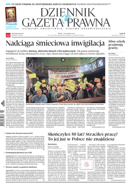 Co grozi firmom za udostępnianie danych osobowych osobom nieupoważnionym; zaglądanie do kubłów, donosy, zbieranie danych z list wyborczych – tak gminy zamierzają weryfikować liczbę mieszkańców, by po 1 lipca skutecznie ściągać od nich opłaty za wywóz odpadów; uczelnie z Warszawy, Gdańska i Krakowa zdobywają zdecydowaną większość grantów przyznawanych przez Narodowe Centrum Nauki; dyrektorzy szkół zwolnili w 2012 r. siedem tysięcy nauczycieli – tak wynika z danych, które opracowało Ministerstwo Edukacji Narodowej; Polacy wystraszyli się bezrobocia i zaczęli gromadzić pieniądze na czarną godzinę; z 23 zł do 30 zł wzrośnie wysokość świadczenia, jakie pracownicy otrzymują z tytułu delegacji na obszarze kraju.