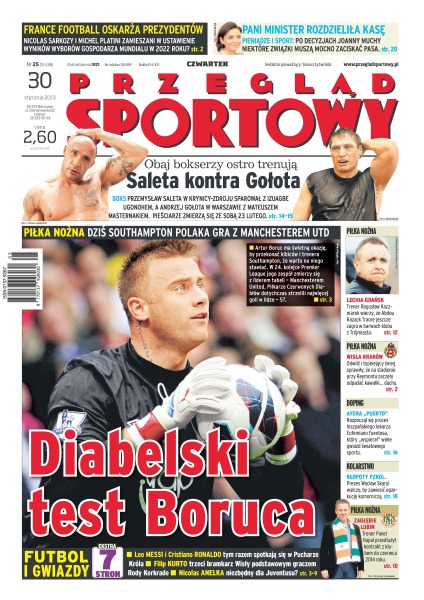 Artur Boruc ma świetną okazję, by przekonać kibiców i trenera Southampton, że warto na niego stawiać; podstawowy bramkarz reprezentacji Polski w tym sezonie jest tylko rezerwowym w PSV Eindhoven; już dawno Real Madryt nie przystępował do meczu z Barceloną z tak przetrzebioną kontuzjami i czerwonymi kartkami obroną; pół dnia na lotnisku w Paryżu spędziła kadra Waldemara Fornalika; wiekowi rywale próbują odzyskać szybkość, sparując z bokserami lżejszymi o 20 kilogramów – rozpoczęli decydujący okres przygotowań; minister Joanna Mucha przedstawiła założenia nowego programu wspierania przez rząd poszczególnych dyscyplin.