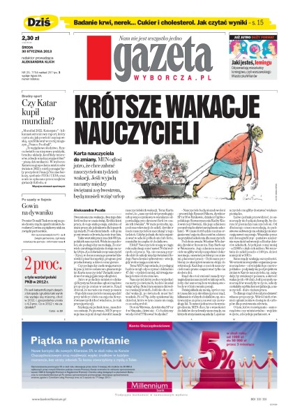 MEN ogłosi jutro, że chce zabrać nauczycielom tydzień wakacji – jeśli wyjadą na narty między świętami a sylwestrem, będą musieli wziąć urlop; premier Donald Tusk wczoraj na posiedzeniu rządu zganił ministra Jarosława Gowina za piątkową szarżę w Sejmie przeciwko związkom partnerskim; eksperymentalny program polegał na pójściu do fryzjera, dentysty, kosmetyczki, kupieniu sobie koronkowej bielizny – spośród trzydziestu sześciu bezrobotnych pań dwadzieścia pięć podpisało po metamorfozie umowy o pracę; topniejąca Daleka Północ to szansa czy zagrożenie; zanim zaczniemy się badać na wszystkie możliwe sposoby, lepiej najpierw iść do internisty na ogólne badanie lekarskie; handel zagraniczny był i będzie głównym motorem napędzającym naszą gospodarkę – dzięki niemu nie wpadliśmy w recesję i dzięki niemu mamy wyjść ze spowolnienia.