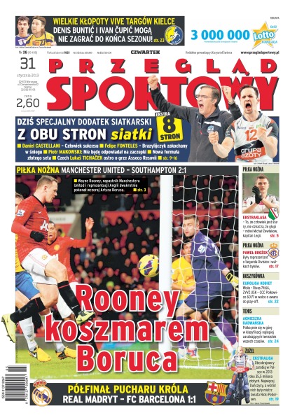 Wayne Rooney, napastnik Manchesteru United i reprezentacji Anglii dwukrotnie pokonał wczoraj Artura Boruca; oba zespoły marnowały okazje na potęgę – 20–letni Raphael Varane uratował remis Realowi, ale to Barca jest faworytem do awansu do półfinału Pucharu Króla; Jakub Jarosz poprowadził Andreoli Latinę do zwycięstwa nad Lube Banca Macerata; 35,5 miliona złotych wywiozą w tym roku z Polski zagraniczni żużlowcy; Artur Szpilka nie narzeka na aklimatyzację w USA – w piątkowym starciu z Mikiem Mollo jego forma ma eksplodować; Agnieszka Radwańska już 22. na liście wszech czasów.