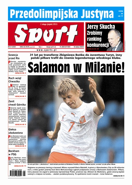 31 lat po transferze Zbigniewa Bońka do Juventusu Turyn, inny polski piłkarz trafił do równie legendarnego włoskiego klubu; bardziej doświadczony z polskich bramkarzy w Premier League spisuje się coraz lepiej, natomiast młodszy nie czuje się zbyt pewnie; francuski nowicjusz usunął w cień Messiego i Cristiana Ronaldo – następnego dnia po meczu z Barceloną otrzymał powołanie do reprezentacji na spotkanie z Niemcami; Marcin Gortat zdobył 14 punktów i miał 12 zbiórek – to 16. double-double polskiego środkowego w sezonie; przez najbliższe trzy dni Soczi będzie areną kolejnych zawodów Pucharu Świata – dla Justyny Kowalczyk i reszty to ostatnia szansa, by zaznajomić się z trasami przed przyszłorocznymi igrzyskami; walka Artura Szpilki z Mikiem Mollo jest wielką niewiadomą, bo w ringu zobaczymy boksera silnego, ale młodego i nieobliczalnego oraz rutyniarza, uważanego kiedyś za wielki talent.