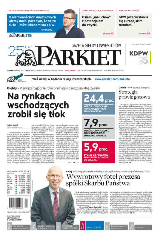 Największy w Polsce newsroom gospodarczy zbiera, analizuje i zgłębia dla Państwa najważniejsze informacje ze świata finansów. Codzienne wydanie „Parkietu”, sześć dni w tygodniu, to kilkadziesiąt artykułów o emitentach, instytucjach finansowych, gospodarce. To również opinie, felietony i wywiady z najważniejszymi ludźmi krajowej i globalnej finansjery.