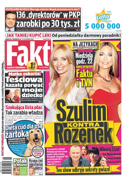 Szokująca lista płac rządzących; brud, smród i ubóstwo – już nawet sanepid alarmuje, że pociągami nie da się podróżować, takie są zaniedbane; jak odchudzić psa żarłoka; show Faktu i TVN już w niedzielę o godz . 22.00; ubierz się jak Ola Kisio; dlaczego tylko wybrani w razie utraty posady mogą liczyć na sowite odprawy, a przeciętny Polak musi utrzymać się z zasiłku; banki biorą na celownik właścicieli małych firm i dają im gotówkę; spółdzielcze kasy alternatywą dla banków; wpadka dziewczyny Koseckiego; katastrofa Justyny Kowalczyk – Polka dopiero 43. w sprincie na trasie olimpijskiej w Soczi; czy w Hiszpanii politycy przez kilkanaście lat dostawali pensje od prywatnych firm.