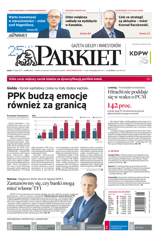 Największy w Polsce newsroom gospodarczy zbiera, analizuje i zgłębia dla Państwa najważniejsze informacje ze świata finansów. Codzienne wydanie „Parkietu”, sześć dni w tygodniu, to kilkadziesiąt artykułów o emitentach, instytucjach finansowych, gospodarce. To również opinie, felietony i wywiady z najważniejszymi ludźmi krajowej i globalnej finansjery.
