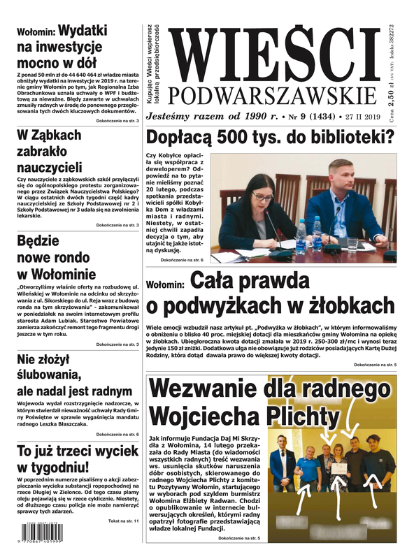 Wieści Podwarszawskie istnieją od 1990 roku i od 27 lat w każdą środę ukazuje się nasz nowy numer. Od samego początku jesteśmy gazetą płatną, niezależną, utrzymującą się z reklam i sprzedaży. Gazetę tworzą profesjonalni dziennikarze z kilkunastoletnim stażem, którzy opisują wszystko, co dzieje się na terenie powiatu wołomińskiego, nie zważając na opcje polityczne. Nasze materiały, którymi nierzadko zmieniamy lokalną rzeczywistość, są cytowane przez ogólnopolskie media, stając się tematem ich interwencji.Od 26 lat bierzemy udział we wszystkich najważniejszych wydarzeniach lokalnych i mamy bezpośredni kontakt z Czytelnikami. Przez ten czas witaliśmy i żegnaliśmy kilka gazet lokalnych – pozostając jedyną niezależną gazetą, sprzedawaną na naszym terenie, regularnie tydzień w tydzień. Jesteśmy „prasą pierwszego kontaktu” i mamy świadomość, że takie określenie zobowiązuje.