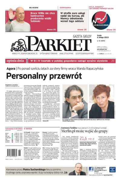 Agora – po ponad sześciu latach za stery firmy wraca Wanda Rapaczyńska; Bruce Willis nie chce bankructwa producenta wódki Sobieski; w strefie euro usługi nadal się kurczą, ale Niemcy odnotowały wzrost tego sektora; kierowana przez Piotra Sucharskiego Neuca pomimo trudnego rynku poprawia wyniki i liczy na kolejny dobry rok; sieć pasaży handlowych Czerwona Torebka podpisała list intencyjny w sprawie przejęcia znanego sklepu internetowego Merlin.pl.