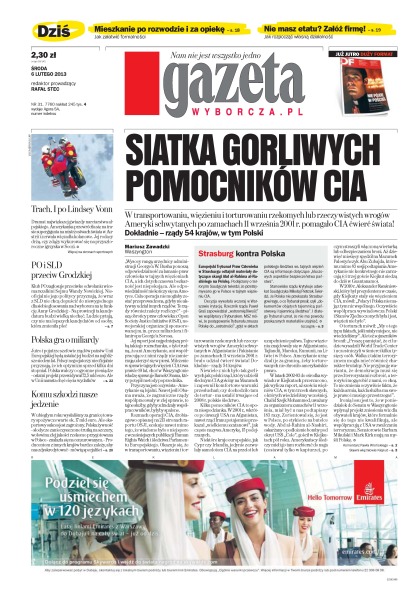 W transportowaniu, więzieniu i torturowaniu rzekomych lub rzeczywistych wrogów Ameryki schwytanych po zamachach 11 września 2001r. pomagało CIA ćwierć świata; mieszkanie po rozwodzie i za opiekę – jak załatwić formalności; załóż firmę – jak rozpocząć własną działalność; PO i SLD przeciw Grodzkiej; Polska gra o miliardy; komu szkodzi nasze jedzenie.