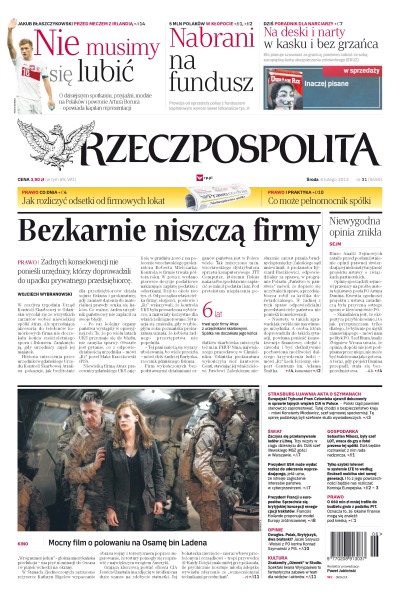 Dlaczego żadnych konsekwencji nie ponieśli urzędnicy, którzy doprowadzili do upadku prywatnego przedsiębiorcę; jak rozliczyć odsetki od firmowych lokat; co może pełnomocnik spółki; Europejski Trybunał Praw Człowieka ujawnił dokumenty w sprawie tajnych więzień CIA w Polsce o dzisiejszym spotkaniu, przyjaźni, modzie na Polaków i powrocie Artura Boruca – opowiada Jakub Błaszczykowski; mocny film o polowaniu na Osamę bin Ladena.