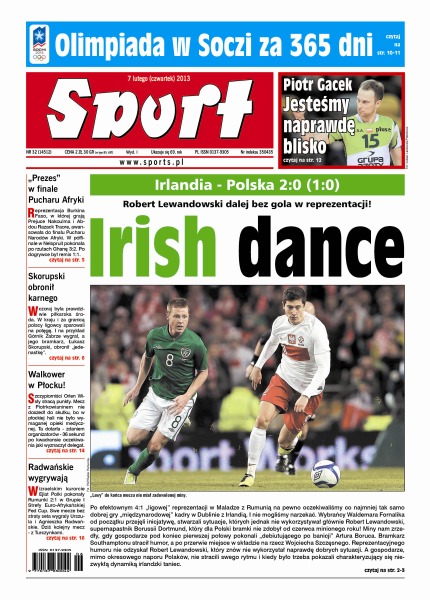 Irlandia - Polska 2:0 (1:0) – Robert Lewandowski dalej bez gola w reprezentacji; Reprezentacja Burkina Faso awansowała do finału Pucharu Narodów Afryki; wczoraj była prawdziwie piłkarska środa – w kraju i za granicą polscy ligowcy sparowali na potęgę; walkower w Płocku – szczypiorniści Orlen Wisły stracą punkty.; w izraelskim kurorcie Ejlat Polki pokonały Rumunki 2:1 w Grupie I Strefy Euro-Afrykańskiej Fed Cup.