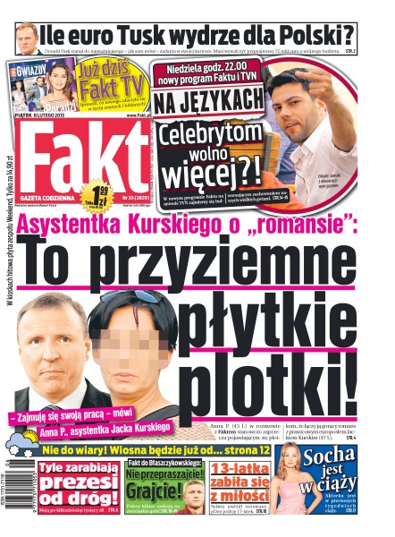 Ile euro Tusk wydrze dla Polski – premier stanął do najważniejszego zadania w swojej karierze; czy celebrytom wolno więcej; asystent Kurskiego o romansie: „to przyziemne plotki”ile zarabiają prezesi od dróg; polscy kibice czekają na zwycięskie gole reprezentacji; 13-latka zabiła się z miłości.