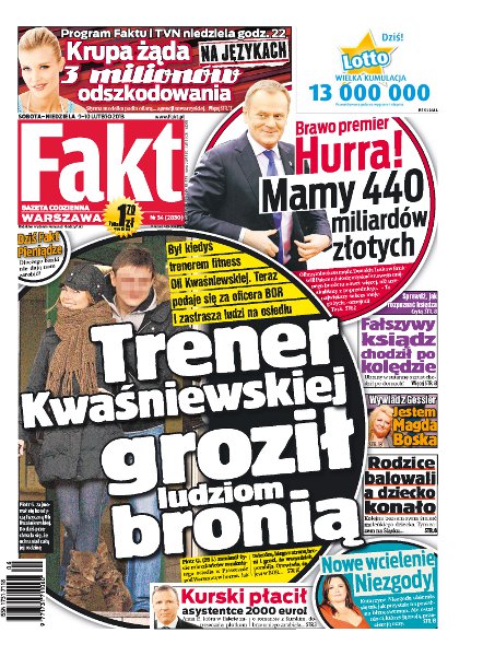 Trener Kwaśniewskiej groził ludziom bronią; Kurski płacił asystentce 2000 euro; mamy 440 miliardów złotych; fałszywy ksiądz chodził po kolędzie; rodzice balowali a dziecko konało; nowe wcielenie Katarzyny Niezgody; aferzyści lądują na ciepłych posadach; szefowie PZPN tracą wiarę w Fornalika.