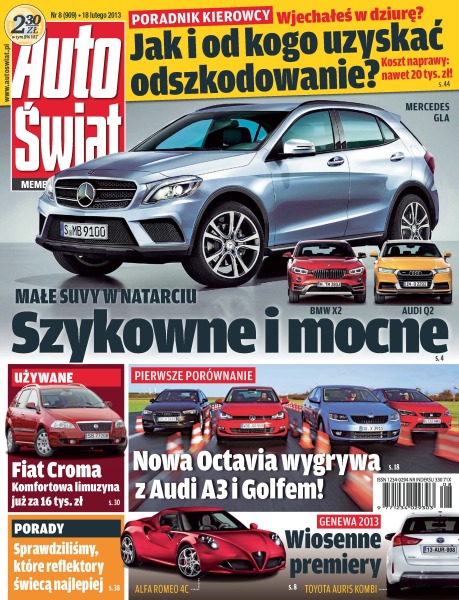 BMW X2, Mercedes GLA i Audi Q2 – przyszłość małych SUV-ów segmentu premium; Porsche Cayman – pierwsza jazda drugą generacją małego coupé z Zuffenhausen; Sébastien Ogier liderem rajdowych mistrzostw świata; Audi A3 Sportback, Seat Leon, Skoda Octavia i VW Golf –porównanie pokrewnych technicznie aut Grupy VW; BMW 6 Gran Coupé – bawarski elegant z 3-litrowym dieslem; ranking aut wg wyników testów na dystansie 100 tys. km. – czym obecnie jeździmy; wielki test reflektorów – jak świecą halogeny, ksenony i lampy LED.