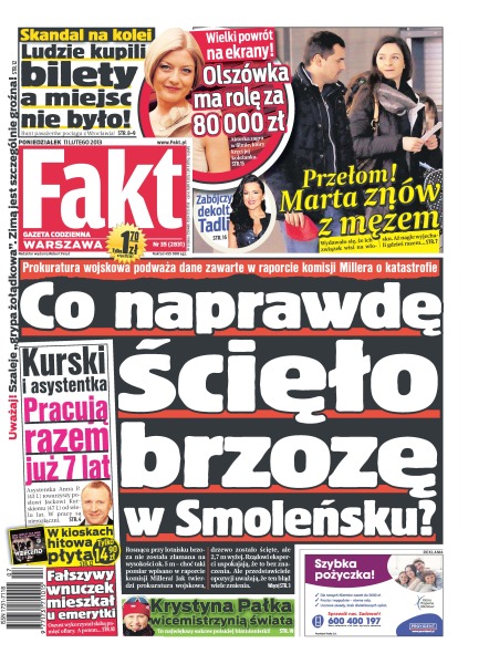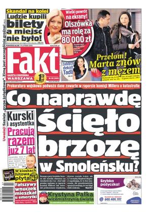 Co naprawdę ścięło brzozę w Smoleńsku – prokuratura wojskowa podważa dane zawarte w raporcie komisji Millera o katastrofie; skandal na kolei – ludzie kupili bilety a miejsc nie było; zabójczy dekolt Beaty Tadli; Kurski i asystentka pracują razem już 7 lat; fałszywy wnuczek mieszkał u emerytki – oszust wykorzystał słabą pamięć ofiary; Krystyna Pałka wicemistrzynią świata – to największy sukces polskiej biathlonistki; Olszówka ma rolę za 80 000 złotych – wielki powrót na ekrany.