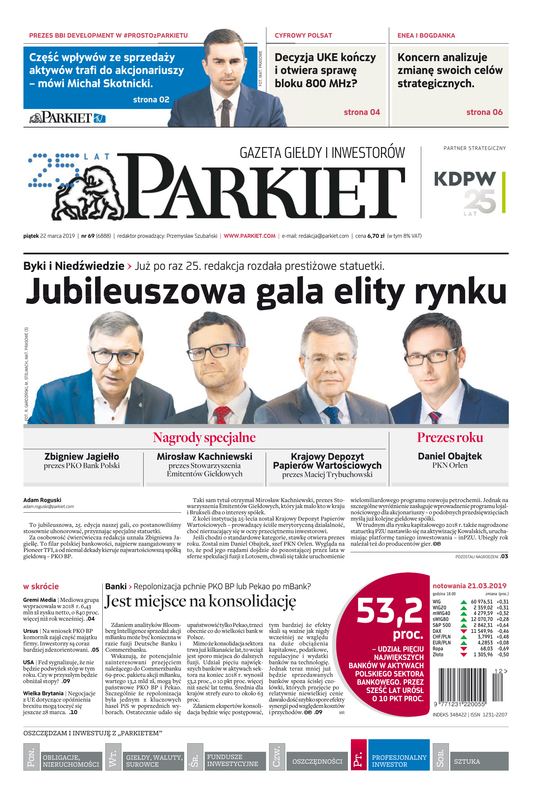 Największy w Polsce newsroom gospodarczy zbiera, analizuje i zgłębia dla Państwa najważniejsze informacje ze świata finansów. Codzienne wydanie „Parkietu”, sześć dni w tygodniu, to kilkadziesiąt artykułów o emitentach, instytucjach finansowych, gospodarce. To również opinie, felietony i wywiady z najważniejszymi ludźmi krajowej i globalnej finansjery.