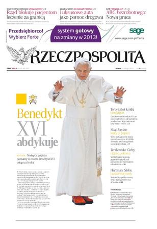 Benedykt XVI abdykuje – następcę papieża poznamy w marcu – Benedykt XVI ustąpi za 16 dni; rząd blokuje pacjentom leczenie za granicą – na refundowane zabiegi, które miały być dostępne za granicą, pacjent będzie potrzebował zgody NFZ; luksusowe auta jako pomoc drogowa – rejestrując sprowadzony z zagranicy luksusowy samochód jako pomoc drogową, na samej akcyzie można zaoszczędzić 200 tys. zł; ABC bezrobotnego – nowa praca – w czym pomoże pośredniak, dla kogo zasiłek, dotacje na rozkręcenie własnego biznesu; skąd będzie kolejny papież – wielu watykanistów stawia na duchownego z Afryki lub Ameryki – włosi liczą jednak na swojego rodaka.