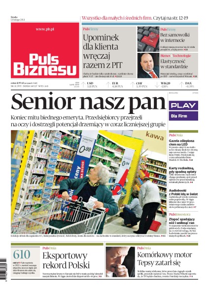 Senior nasz pan – koniec mitu biednego emeryta – przedsiębiorcy przejrzeli na oczy i dostrzegli potencjał drzemiący w coraz liczniejszej grupie; upominek dla klienta wręczaj razem z PIT – chyba że będzie tylko symboliczny – a jeśli nie chcesz płacić VAT — nie droższy niż 10 zł; bez samowolki w internecie – e-sklepy muszą stosować się do wielu przepisów, a będą nowe; eksportowy rekord Polski – nawet potężny kryzys w Europie nie był w stanie podciąć skrzydeł naszym firmom – w ciągu czterech lat eksport urósł o 44 procent.