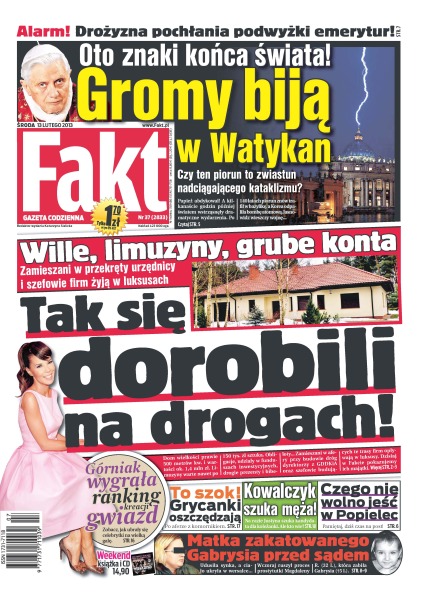 Tak się dorobili na drogach – wille, limuzyny, grube konta – zamieszani w przekręty urzędnicy i szefowie firm żyją w luksusach; Edyta Górniak wygrała ranking gwiazd – zobacz, jak ubrały się celebrytki na wielką galę; to szok – Grycanki oszczędzają po aferze z komornikiem; Kowalczyk szuka męża – na razie Justyna szuka kandydata dla koleżanki; czego nie wolno jeść w Popielec – pamiętaj, dziś czas na post; gromy biją w Watykan – czy ten piorun to zwiastun nadciągającego kataklizmu; alarm – drożyzna pochłania podwyżki emerytur; matka zakatowanego Gabrysia przed sądem – udusiła synka, a ciało ukryła w wersalce.