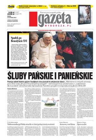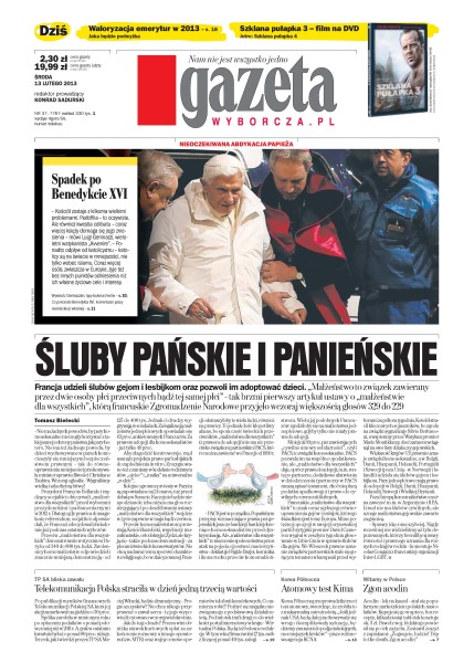 Śluby pańskie i panieńskie – Francja udzieli ślubów gejom i lesbijkom oraz pozwoli im adoptować dzieci; waloryzacja emerytur w 2013 – jaka będzie podwyżka; Telekomunikacja Polska straciła w dzień jedną trzecią wartości – po publikacji wyników finansowych Telekomunikacji Polskiej SA kurs jej akcji zanurkował na giełdzie o 30 procent; atomowy test Kima – Korea Północna przeprowadziła trzeci test atomowy, twierdząc, że zrobiła to z maksymalną ostrożnością; zgon acodin – Acodin, lek na kaszel – stał się popularnym narkotykiem polskich nastolatków.