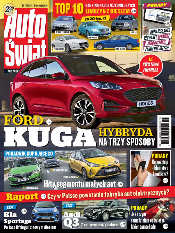 Ranking najoszczędniejszych limuzyn z dieslem; Ford Kuga Premiera trzeciej generacji SUV-a; Renault Clio, Škoda Fabia i Toyota Yaris: którą wersję wybrać; Audi Q3, nowa generacja SUV-a z 230-konnym turbodoładowanym silnikiem benzynowym; Kia Sportage po face liftingu z dieslem 1.6; czy w Polsce powstanie fabryka aut elektrycznych; zdalna weryfikacja używanych samochodów; jak i czym samodzielnie odświeżyć lakier samochodu.