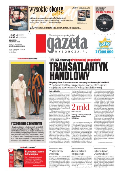 Transatlantyk handlowy – UE i USA stworzą strefę wolnej gospodarki – front Zachodu wobec rosnącej konkurencji Chin i Indii; pożegnanie z wiernymi – po krótkich słowach o abdykacji oraz owacjach wiernych Benedykt XVI wygłosił katechezę, w której mówił m.in. o aborcji i eutanazji; wielkie firmy zwalniają – 1700 osób w TPSA, 700 wLOT, 630 wPZU – wielkie firmy zapowiadają wielkie zwolnienia; Janusz Palikot na spalonym – wyrzucenie Wandy Nowickiej z klubu Ruchu Palikota komplikuje plany stworzenia tzw. listy Kwaśniewskiego na eurowybory; biznesmen, konsul i dziewczyna – „Mam pieniądze, znajomości i prawników. Ale z trudem zapewniłem w Polsce legalny pobyt samotnej Afrykance”.