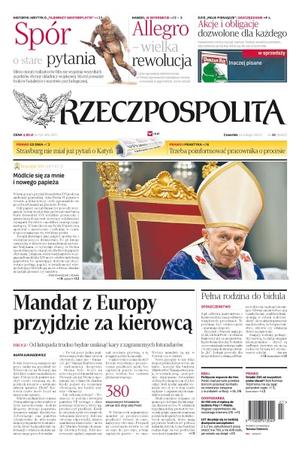 Mandat z Europy przyjdzie za kierowcą – od listopada trudno będzie uniknąć kary z zagranicznych fotoradarów; pełna rodzina do bidula – sąd odbiera małżeństwu z Krakowa dzieci na podstawie wątpliwych przesłanek; Strasburg nie miał już pytań o Katyń; trzeba poinformować pracownika o procesie; „Módlcie się za mnie i nowego papieża” – wierni gorąco przyjęli Benedykta XVI podczas audiencji generalnej, Aula Pawła VI pękała w szwach, a kilka tysięcy osób zgromadziło się przed telebimami na placu św. Piotra; Allegro – wielka rewolucja – lider sprzedaży elektronicznej w Polsce wprowadził największe zmiany w serwisie w jego historii; akcje i obligacje dozwolone dla każdego – inwestować można zacząć zawsze.