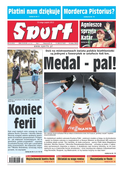 Medal - pal – dziś na mistrzostwach świata polskie biathlonistki są jednymi z faworytek w sztafecie 4x6km; koniec ferii – dziś znad ciepłych mórz wracają do kraju piłkarze Ruchu Chorzów i Górnika Zabrze – wczoraj rozegrali ostatnie spotkania sparingowe na tureckich zgrupowaniach, przegrane, jak większość wcześniejszych; Platini nam dziękuje; czy Oscar Pistorius to morderca; Agnieszce Radwańskiej sprzyja Katar; Wojciechowski kontra Ruch Chorzów; Muszynianka w finale.