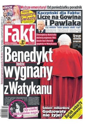 Benedykt będzie wygnany z Watykanu – dostojnicy Kościoła mówią wprost: „Nie może być dwóch papieży w Watykanie”; śmierć miliardera – Gudzowaty nie żyje; „Liczę na Gowina i Pawlaka” – Jarosław Kaczyński dla Faktu – czy minister Tuska pomoże obalić rząd; ale ciało – Joanna Jabłczyńska nago – aktorka nie lubi pokazywać swego ciała – zrobiła jednak wyjątek; czy Bartek oskarży Waśniewską – ojciec Madzi ma prawo zostać oskarżycielem.