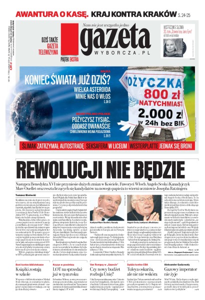 Rewolucji nie będzie – następca Benedykta XVI nie przyniesie dużych zmian w Kościele – faworyci Włoch Angelo Scola i Kanadyjczyk Marc Ouellet oraz reszta liczących się kandydatów na nowego papieża to wierni uczniowie Josepha Ratzingera; awantura o kasę – kraj kontra Kraków; koniec świata już dziś – wielka asteroida minie nas o włos; Boni kontra bibliotekarze – książki zostają w szkole; LOT na sprzedaż już w tym roku – Sebastian Mikosz, nowy prezes narodowego przewoźnika, zapowiada też zwolnienia i cięcie kosztów; Aleksander Gudzowaty – gazowy imperator nie żyje – miał 74 lata, był jednym z najbogatszych polskich przedsiębiorców.
