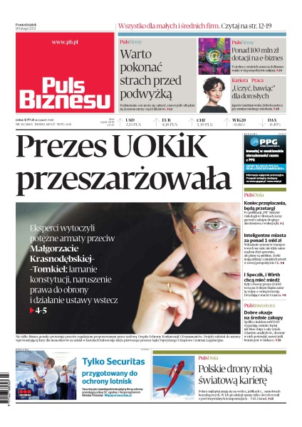 Eksperci wytoczyli potężne armaty przeciw Małgorzacie Krasnodębskiej-Tomkiel: łamanie konstytucji, naruszenie prawa do obrony i działanie ustawy wstecz; po publikacji „PB” Instytut Onkologii w Gliwicach zrezygnował z zakupu drogiego akceleratora z wolnej ręki; wdrażanie systemów transportowych na razie nie idzie samorządom zbyt sprawnie, ale plany są ambitne; były i obecny prezes KGHM toczą na Dolnym Śląsku zażartą wojnę o cenną koncesję; spółki z indeksu mWIG40 wypadają ostatnio lepiej niż blue chipy i cały rynek; Polacy najlepiej znają się na wódce, jabłkach i samolotach bezzałogowych – w ich produkcji mamy tylko dwóch rywali o porównywalnych kompetencjach – USA i Izrael.
