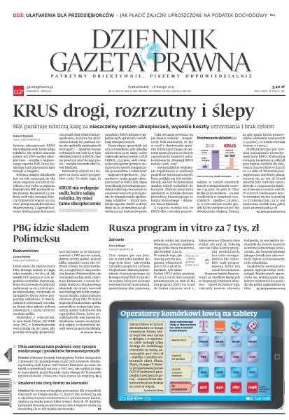 Jak płacić zaliczki uproszczone na podatek dochodowy; NIK punktuje rolniczą kasę za nieszczelny system ubezpieczeń, wysokie koszty utrzymania i brak reform; trzy tysiące par ma jeszcze w tym roku uzyskać dostęp do in vitro – tak wynika z projektu programu Leczenie Niepłodności Metodą Zapłodnienia Pozaustrojowego, do którego dotarł DGP; dobre wieści dla akcjonariuszy PBG, którego walory w ciągu roku staniały z 80 do 5 zł; zdaniem Komisji Europejskiej Polska niezgodnie z prawem UE opodatkowuje część tych towarów obniżoną stawką, czyli 8 proc. VAT; nie wystarczy bezpłatnych miejsc dla wszystkich chętnych na drugie studia. Ci, którzy nie zmieszczą się w określonym przez ministerstwo 10-procentowym limicie, zapłacą za naukę nawet kilka tysięcy złotych; zakup tabletu w ramach abonamentu to droga inwestycja – klient, który kupi taki sam sprzęt w sklepie, a u operatora GSM wykupi tylko dostęp do mobilnego internetu na kartę, zaoszczędzi 400–600 zł.