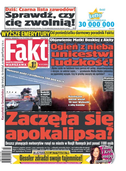 Zaczęła się apokalipsa – deszcz płonących meteorytów runął na miasto w Rosji – rannych jest ponad 1000 osób; czy Tadla i Kret mają romans; objawienie Matki Boskiej z Akity – ogień z nieba unicestwi ludzkość; czarna lista zawodów – sprawdź, czy cię zwolnią; Na językach – Gessler zdradzi swoje tajemnice – to już trzeci odcinek show; „Jak trotyl, to trotyl, a nie perfumy” – Jarosław Kaczyński o Smoleńsku.