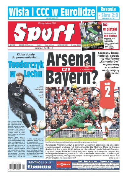 Nazwa General Motors, nowego sponsora, nie trafi na koszulki gliwiczan; pobyt w klubie z Bawarii odcisnął piętno na karierze Lukasa Podolskiego – chłopak z Gliwic długo dochodził po nim do siebie; od ponad trzech lat Porto nie przegrało u siebie w LM; organizatorzy gali 23 lutego, której głównym punktem będzie pojedynek Andrzeja Gołoty z Przemysławem Saletą, liczą na komplet widzów w Ergo Arenie oraz grubo ponad sto tysięcy chętnych na płatną transmisję; koszykarki Wisły Can-Pack Kraków i CCC Polkowice rozpoczynają dzisiaj walkę o awans do turnieju finałowego Euroligi; młodsza Radwańska wygrała z Japonką i dziś zagra z Chinką; Monika Hojnisz strzelała w niedzielę znakomicie, a że poparła to szybkim biegiem, medal stał się faktem.