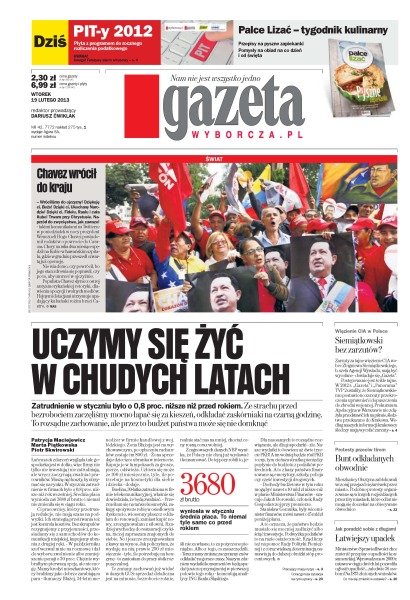 Jeden na trzech pracowników liczy się z tym, że w każdej chwili może zostać bez pracy – czy strach przed utratą pracy może być gorszy od bezrobocia; dlaczego proces Katarzyny W. oskarżonej o zabicie półrocznej córki Magdy będzie w większości jawny; co możesz zrobić, gdy sąsiad notorycznie zalewa ci mieszkanie, na podwórku urządza złomowisko, a śmieci wyrzuca przez okno; syryjski konflikt dawno przestał być tylko rebelią przeciwko dyktaturze; jak Kopernik pomógł policzyć niemieckie czołgi; coraz więcej dzieci rodzi się w związkach nieformalnych; na początku roku zmieniły się zasady szkolenia przyszłych kierowców – inaczej też wygląda część teoretyczna egzaminu na prawo jazdy; Ministerstwo Sprawiedliwości chce zmienić przepisy o upadłości konsumenckiej, by ułatwić ludziom wyplątywanie się z długów; do leżących na deskach londyńczyków przyjeżdża nokautujący rywali Bayern – dla Wojciecha Szczęsnego to jeden z meczów o przetrwanie w bramce Arsenalu.
