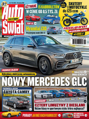 Mercedes GLC: kolejna generacja SUV-a na bazie klasy C; pierwsza jazda Toyotą Camry; Jaguar XE po face liftingu; relacja z salonu w Szanghaju; poradnik kupującego jednoślady do 125 ccm; BMW serii 3, Kia Stinger, Mazda 6 i Mercedes klasy C - porównanie modeli klasy średniej z dieslami; przegląd rynku wtórnego kabrioletów.