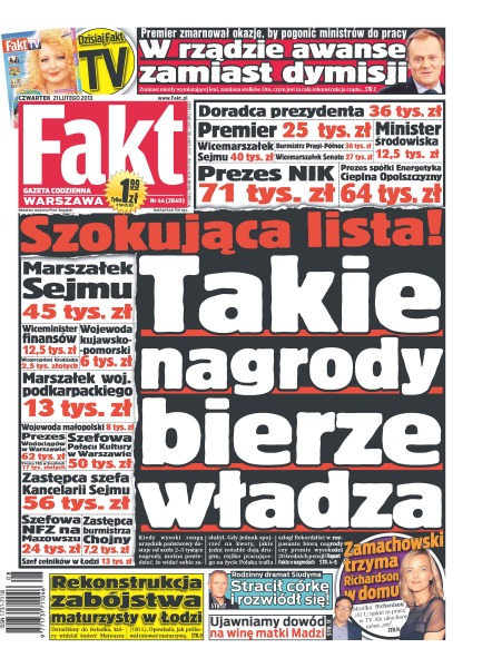 Szokująca lista – jakie nagrody bierze władza; 68% Polaków uważa, że rząd nie daje szans na poprawę sytuacji gospodarczej w kraju, a 45% chce dymisji słabych ministrów, wśród których wymienia się Arłukowicza, Nowaka i Muchę; pracownik naukowy Uniwersytetu Wrocławskiego i radny SLD Piotr Ż. został zatrzymany; Sonia Bohosiewicz na zakupy zabrała ze sobą synka Teodora; Joanna Kulig opowiada nam o pracy z tak wielkimi gwiazdami, jak Binoche i Ethan Hawke; Komisja Ligi uznała, że Śląsk nie miał racji, blokując transfer piłkarza; piłkarze Górnika Zabrze przygotowują się do meczu w skandalicznych warunkach; Justyna Kowalczyk staje dziś przed szansą zdobycia złota w sprincie na mistrzostwach świata.