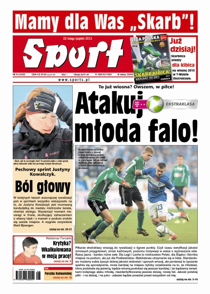 Piłkarze ekstraklasy wracają do rywalizacji o ligowe punkty; porażkę w Katalonii przyjęto spokojnie – teraz Barcelona koncentruje się na meczach z Realem Madryt; Milanem martwić się będzie później; w Warszawie interesuje nas tylko zwycięstwo – mówi trener biało-zielonych, Bogusław Kaczmarek; Andrzej Gołota ostatni raz walczył w 2009 roku, Przemek Saleta w 2006, a mimo to ich starcie – bez żadnej stawki, natury raczej sentymentalnej – wywołało wielkie emocje; w pierwszej konkurencji mistrzostw świata w Val di Fiemme Justyna Kowalczyk była najlepsza do finału – w nim upadła i przybiegła na metę jako ostatnia.