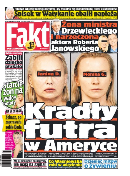 Benedykt XVI podjął decyzję o rezygnacji, gdy dowiedział się o homoseksualnej frakcji wśród biskupów; żona ministra Drzewieckiego i narzeczona aktora Roberta Janowskiego kradły futra w Ameryce; w Szczecinie rodzice zabili dziecko, bo płakało; 10 mitów o jedzeniu; Justyna Kowalczyk nie chciała analizować wideo z upadku w sprincie.