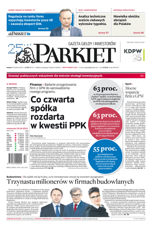 Największy w Polsce newsroom gospodarczy zbiera, analizuje i zgłębia dla Państwa najważniejsze informacje ze świata finansów. Codzienne wydanie „Parkietu”, sześć dni w tygodniu, to kilkadziesiąt artykułów o emitentach, instytucjach finansowych, gospodarce. To również opinie, felietony i wywiady z najważniejszymi ludźmi krajowej i globalnej finansjery.