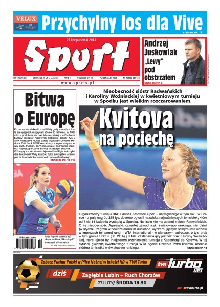 Nieobecność sióstr Radwańskich i Karoliny Woźniackiej w kwietniowym turnieju BNP Paribas Katowice Open w Spodku jest wielkim rozczarowaniem; faworytem w pierwszej ćwierćfinałowej potyczce Pucharu Polski jest Zagłębie Lubin, które w lidze rozbiło Pogoń i chce dzisiaj to samo uczynić z Ruchem Chorzów; na inaugurację rundy wiosennej 15 zespołów zaprezentowało graczy pozyskanych w zimowym okienku transferowym.