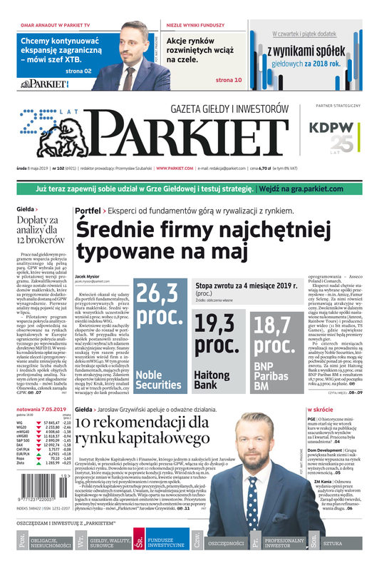 Największy w Polsce newsroom gospodarczy zbiera, analizuje i zgłębia dla Państwa najważniejsze informacje ze świata finansów. Codzienne wydanie „Parkietu”, sześć dni w tygodniu, to kilkadziesiąt artykułów o emitentach, instytucjach finansowych, gospodarce. To również opinie, felietony i wywiady z najważniejszymi ludźmi krajowej i globalnej finansjery.
