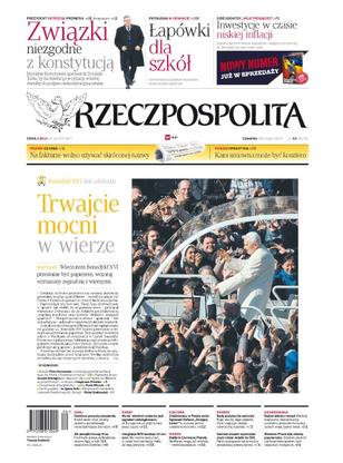 Wieczorem Benedykt XVI przestanie być papieżem, wczoraj wzruszony żegnał się z wiernymi; Bronisław Komorowski ostrzegał premiera w sprawie zgodności związków partnerskich z konstytucją; wynik wyborów we Włoszech to sygnał ostrzegawczy, że Europa ma już dość kuracji przez cięcia; Agnieszka Holland w „Gorejącym krzewie” portretuje komunizm bez czarno-białych schematów.