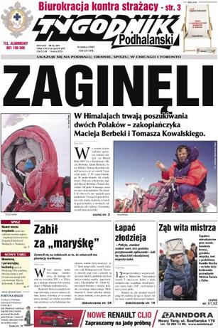 Zaginęli – w Himalajach trwają poszukiwania dwóch Polaków – zakopiańczyka Macieja Berbeki i Tomasza Kowalskiego; biurokracja kontra strażacy; zabił za „maryśkę” – zemścił się na rodzicach za to, że zniszczyli mu plantację marihuany; łapać złodzieja – „Policja, zamiast szukać nart, trzy godziny przyjmowała zgłoszenie” – żali się właściciel okradzionej wypożyczalni; Ząb wita mistrza – szpalery mieszkańców przy szosie, banderia konna, góralska muzyka, tort z podobizną Kamila Stocha - to było iście królewskie przywitanie Mistrza Świata z Zębu; niewierną i perwersyjną kochanką nazwał Platformę Obywatelską dotychczasowy szef jej nowotarskiego koła, wicestarosta Maciej Jachymiak, i odszedł.