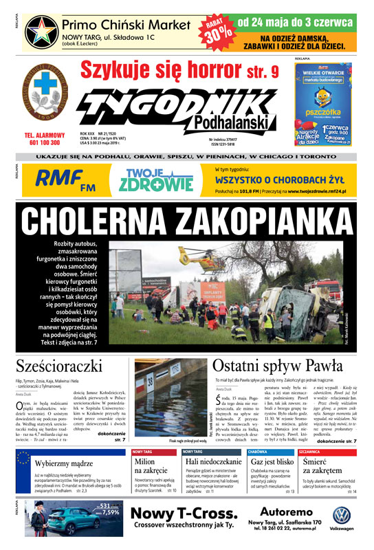 Tragiczny bilans poniedziałkowego wypadku na zakopiance w Rdzawce; otoczeniu niskiej zabudowy na skraju Równi Krupowej wyrośnie ogromny apartamentowiec; o mandat w Brukseli ubiega się 5 osób związanych z Podhalem; sześcioraczki z Tylmanowej.