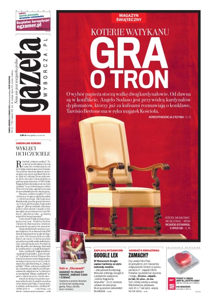 O wybór papieża stoczą walkę dwaj kardynałowie – Angelo Sodano jest przywódcą kardynałów dyplomatów a Tarcisio Bertone ma w ręku majątek Kościoła; w Niemczech Google zapłaci tantiemy za użyte materiały mediów; sondaż CBOS na temat tragedii smoleńskiej; wali się ludowe imperium Władysława Serafina; przez kilka godzin rodzice dziewczynki nie mogli się doprosić o pomoc dla dziecka z temperaturą 41,5 stopnia i drgawkami – dwuipółletnia Dominika zmarła.