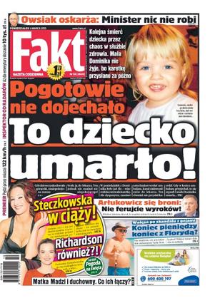 Kolejna śmierć dziecka przez chaos w służbie zdrowia – mała Dominika nie żyje, bo karetkę przysłano za późno; Owsiak oskarża: minister nic nie robi; Steczkowska w ciąży, czy Richardson również; Wałęsa po skandalu z gejami – koniec pieniędzy koniec z Florydą; matka Madzi i duchowny – co ich łączy.