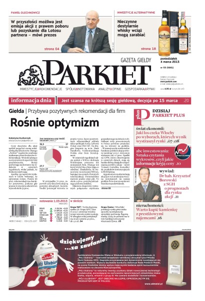 Przybywa pozytywnych rekomendacji dla firm – rośnie optymizm; w przyszłości możliwa jest emisja akcji z prawem poboru lub pozyskanie dla Lotosu partnera – mówi prezes Paweł Olechnowicz; inwestycje alternatywne – nieczynne destylarnie whisky wciąż mogą zarabiać; jaki los czeka Włochy po wyborach, których wynik wystraszył rynki.