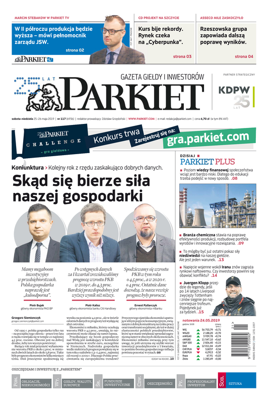 Największy w Polsce newsroom gospodarczy zbiera, analizuje i zgłębia dla Państwa najważniejsze informacje ze świata finansów. Codzienne wydanie „Parkietu”, sześć dni w tygodniu, to kilkadziesiąt artykułów o emitentach, instytucjach finansowych, gospodarce. To również opinie, felietony i wywiady z najważniejszymi ludźmi krajowej i globalnej finansjery.