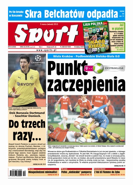 Wisła Kraków - Podbeskidzie Bielsko-Biała 0:0 – wiosenna dobra gra Podbeskidzia w T-Mobile Ekstraklasie to już nie jest zjawisko, o którego prawdziwości można by dyskutować; już dziś w Lidze Mistrzów Borussia Dortmund zagra z Szachtarem Donieck; Manchester United - Real Madryt – Ferguson w krainie świętości; sprawa reprezentacji wygląda bardzo ciekawie - przyznał Marcin Gortat po spotkaniu z selekcjonerem Dirkiem Bauermannem, środkowy Phoenix Suns nie zadeklarował jednak swojej gry w tegorocznym EuroBaskecie; skoczkowie opuścili już Predazzo, gdzie przez ostatnie kilkanaście dni walczyli o medale mistrzostw świata.